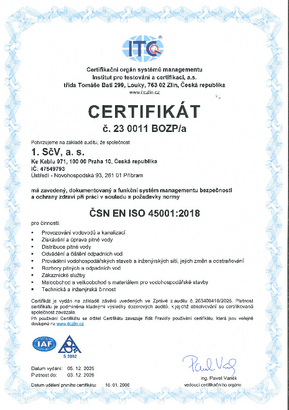 Získaná certifikace má vliv na celý rozsah našich činností a zařízení společnosti a klade vysoké nároky na kvalitu námi poskytovaných služeb. Celý projekt certifikace byl zahájen začátkem roku 2008, a to analýzou stavu společnosti k srpnu 2007. Po nápravných opatřeních společnost 1. SčV, a.s. splnila všechny podmínky certifikačního auditu. Základním výsledkem celé akce je vznik uceleného systému řízení, který zajišťuje plnění všech požadavků na bezpečnost, životní prostředí a kvalitu platných k datu zavedení tohoto systému.