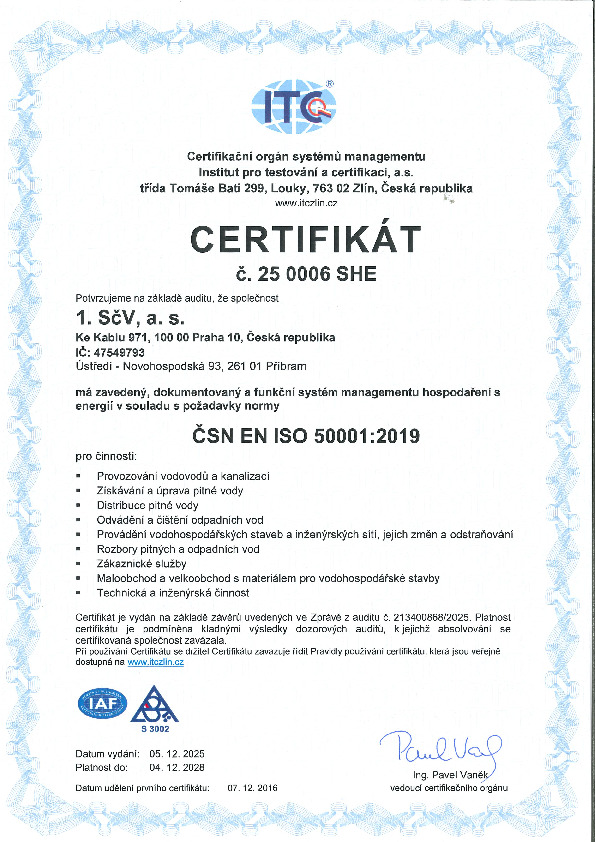 Certifikát ČSN EN ISO 50001:2019 prokazuje, že společnost má zavedený, dokumentovaný a funkční systém managementu hospodaření s energií.