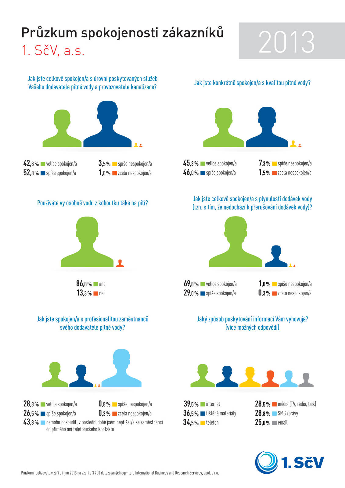 Na čtyři stovky respondentů oslovila společnost 1.SčV, a. s. během září a začátkem října 2014 v rámci průzkumu spokojenosti zákazníků. Ten se týkal úrovně služeb, poskytovaných informací nebo kvality dodávané vody. Obyvatelé měst a obcí na Příbramsku, Praze-Západ a Praze-Východ prokázali vysokou spokojenost se službami i s kvalitou vody.